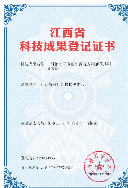 (6)本项目已申报中国专利,专利名称是:“一种治疗哮喘的中药复方制剂及其制备方法”,专利申请号:200410042620.8。现已获得发明专利证书,保护期20年。